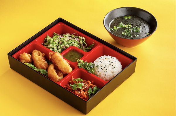 С кальмаром темпура, коул слоу, корейской морковью, рисом и соусом шичими
