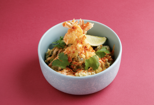 Донбури с креветками темпура, авокадо и соусом свит чили