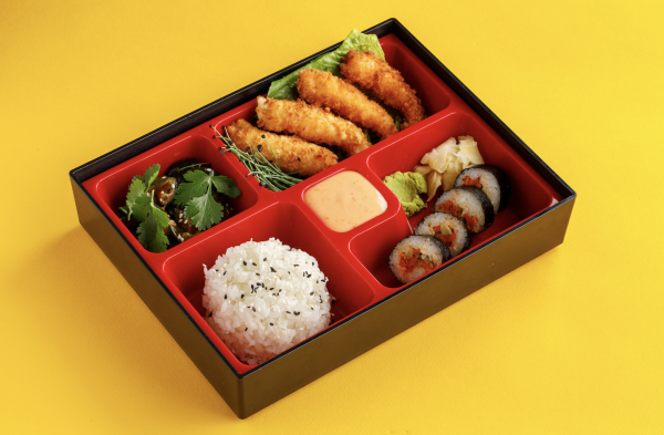 С креветками темпура, овощными норимаки, маринованными огурцами, рисом и соусом Bang Bang